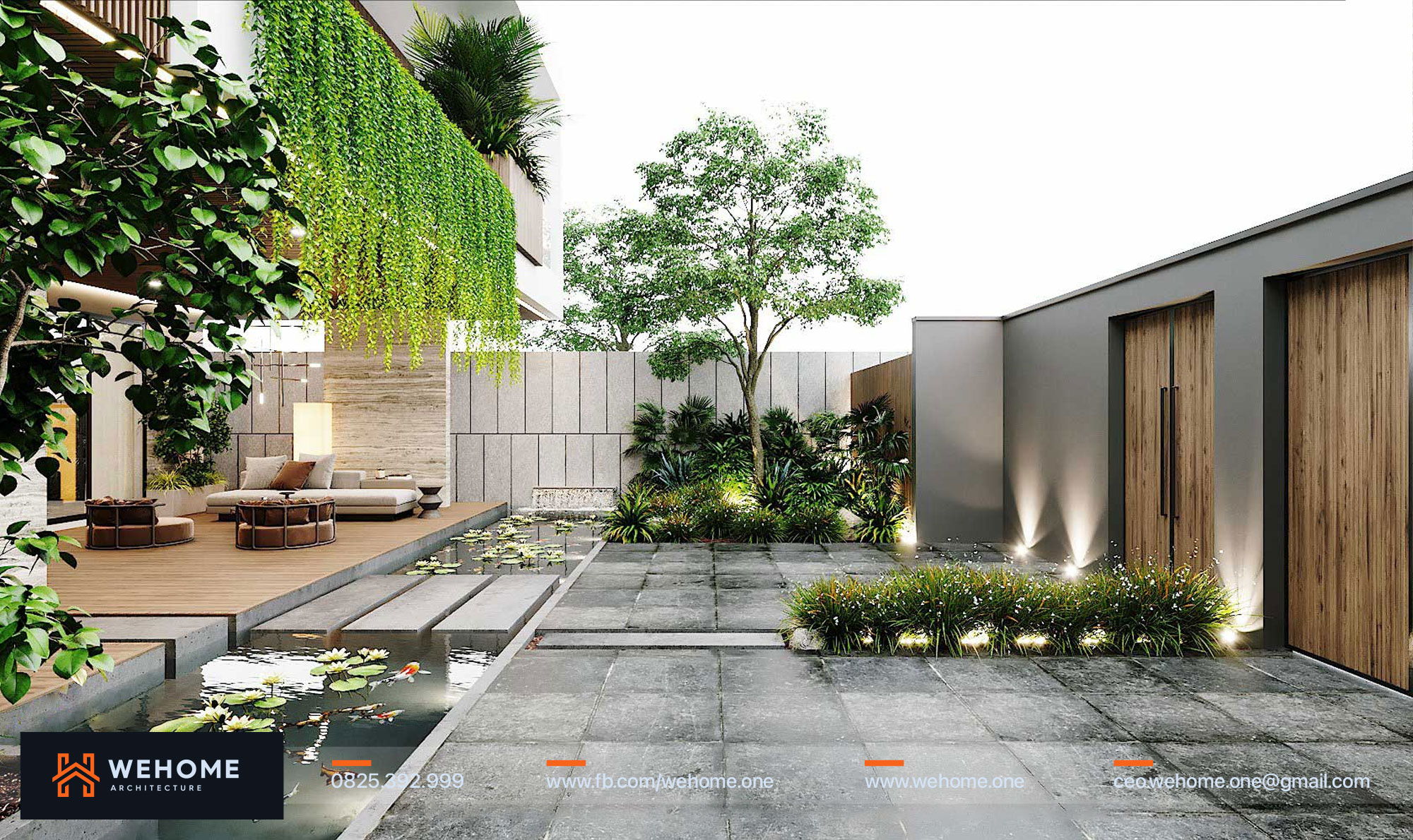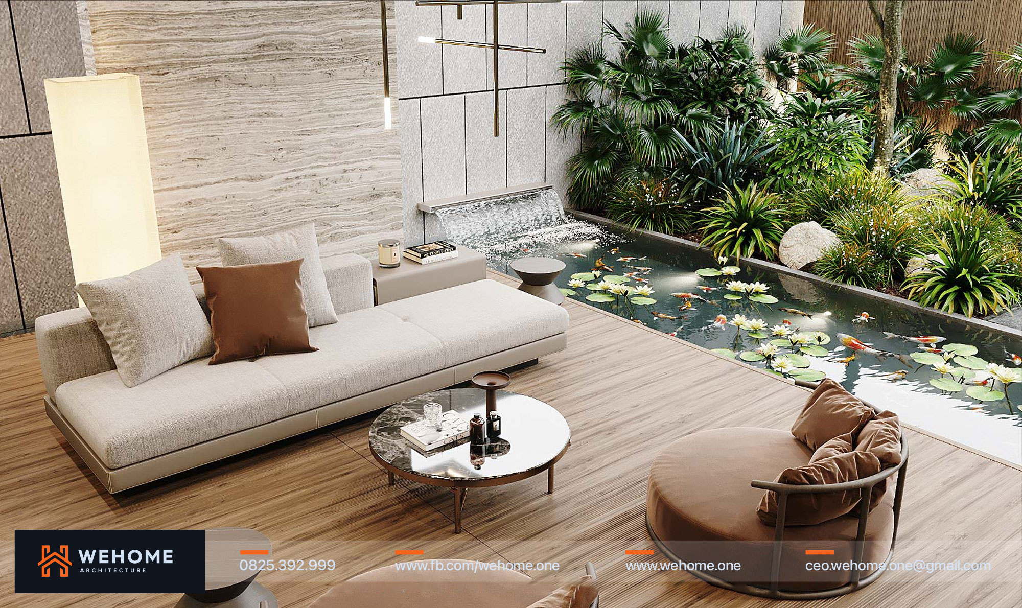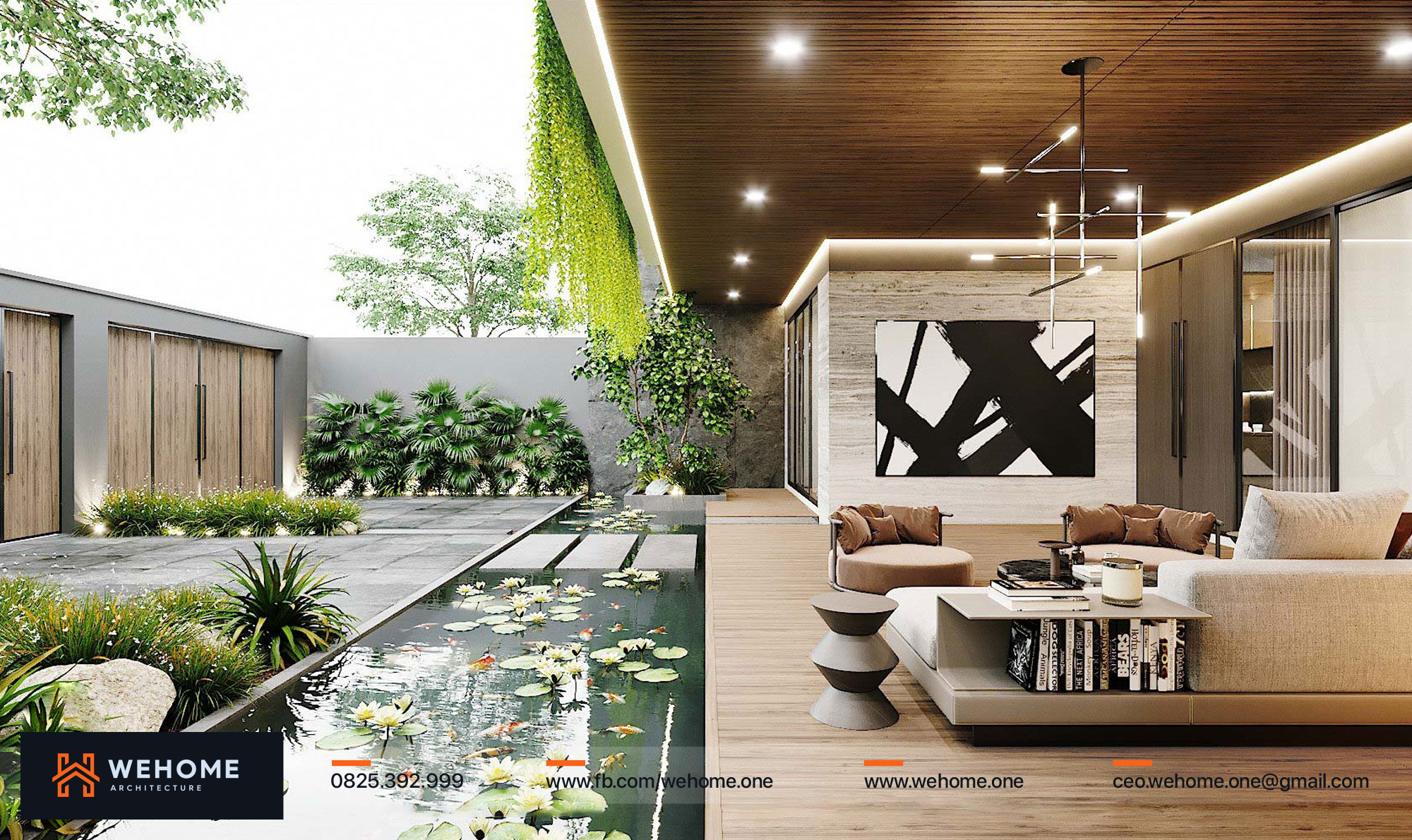 Từ khu vực bàn ăn chúng ta có thể kết nối với không gian xanh và hồ cá trong sân của biệt thự. Điều này càng minh chứng cho thấy các thiết kế của Wehome luôn hướng đến các không gian mở, giúp con người sống một cuộc sống xanh.