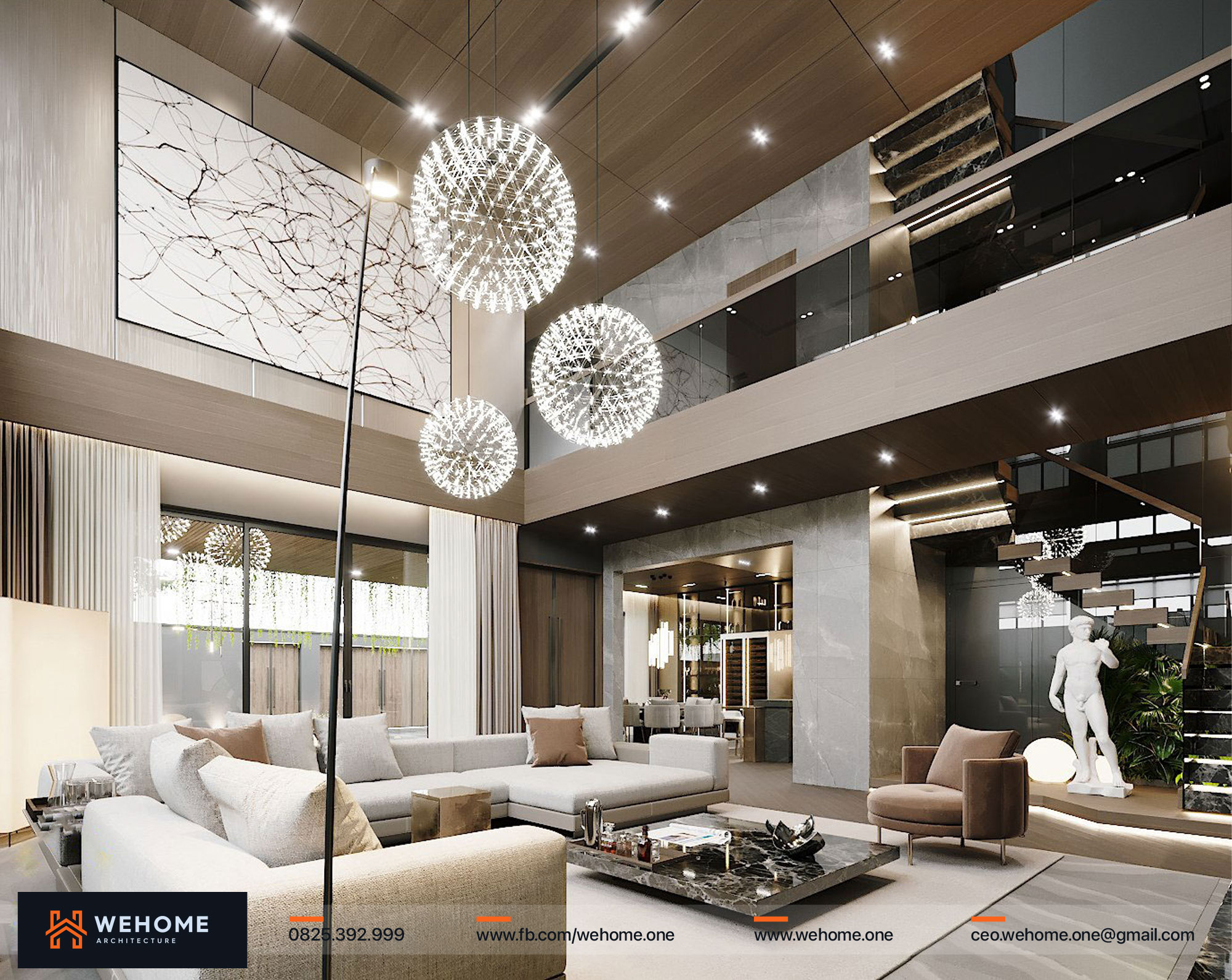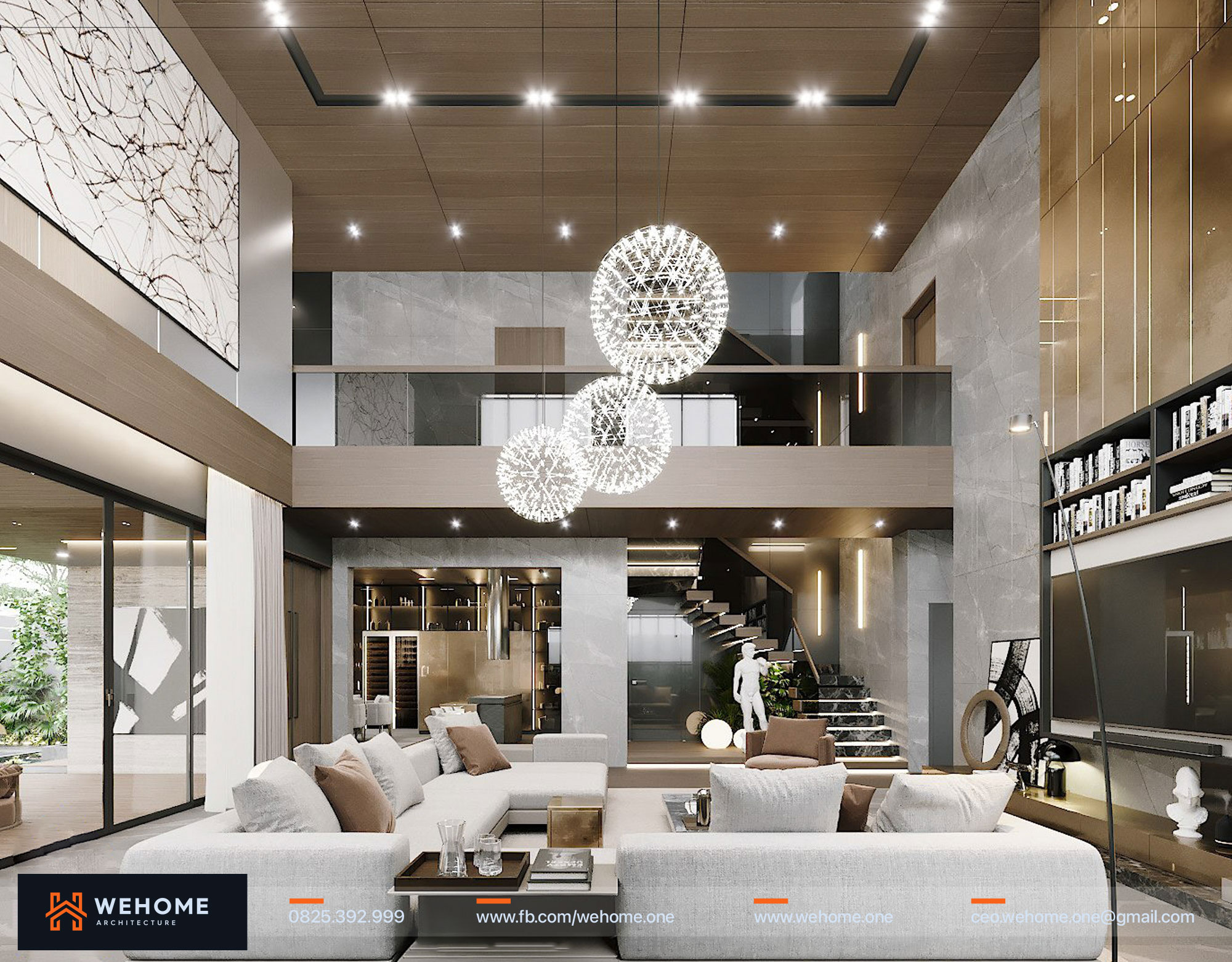 Với góc nhìn này mọi người có thể thấy được toàn cảnh căn phòng khách siêu đẹp này. Yếu tố ánh sang trong căn biệt thự này không phải là vấn đề khi đã có các kiến trúc sư của Wehome. Cửa kính lớn trải dài từ sàn lên đến trần giúp căn phòng khách có rất nhiều ánh sáng tự nhiên chiếu vào. Để không gian phòng khách không bị lạc lõng bởi tone màu trắng sáng thì những điểm nhấn xanh từ vườn cây được trồng kéo dài tạo thêm sức sống cho căn phòng khách.