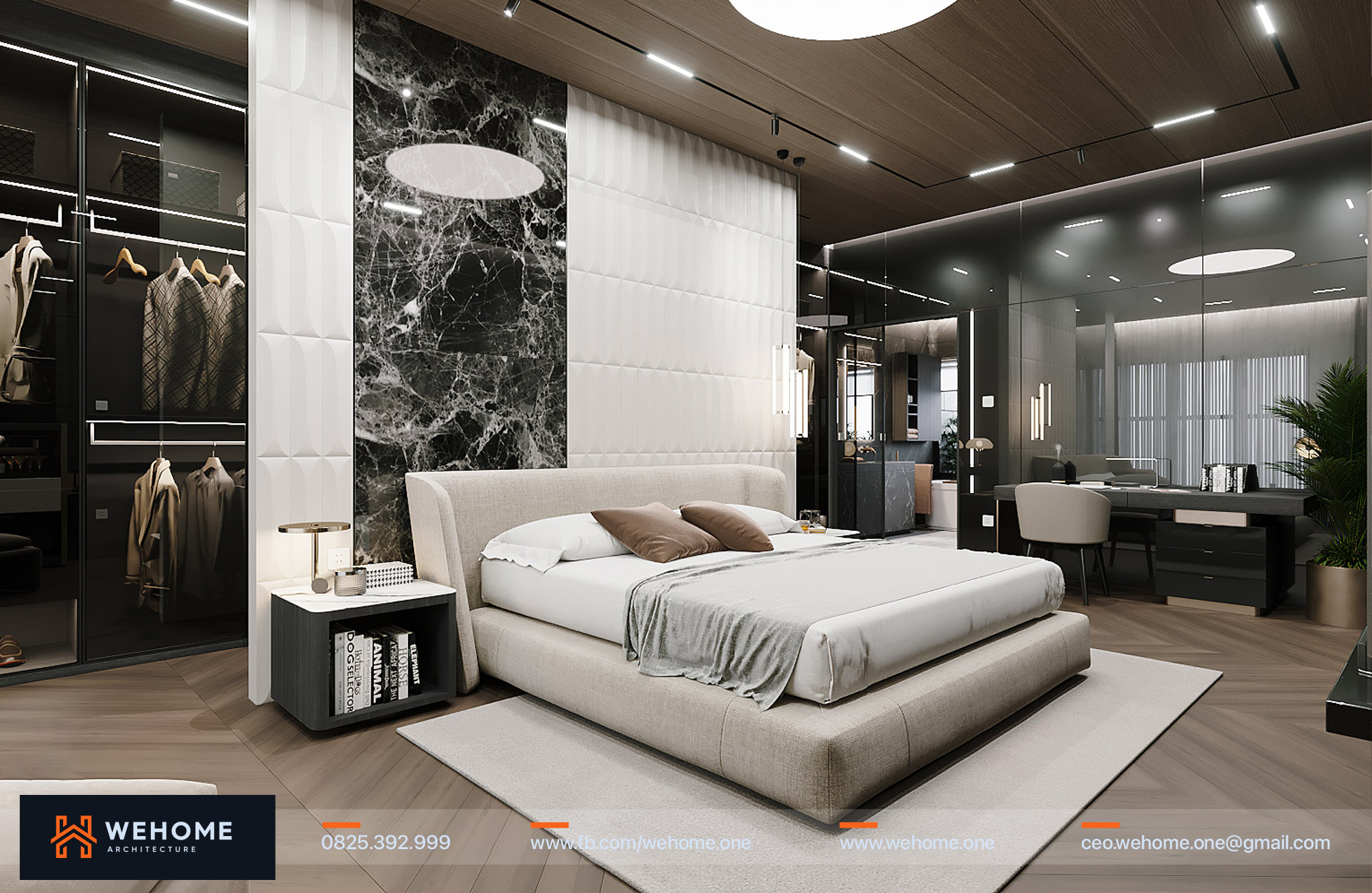 Phòng ngủ rộng rãi đầy đủ các tiện nghi như phòng thay đồ, nhà vệ sinh riêng biệt, bàn làm việc và chiếc giường nỉ rất mềm mại, êm ái.