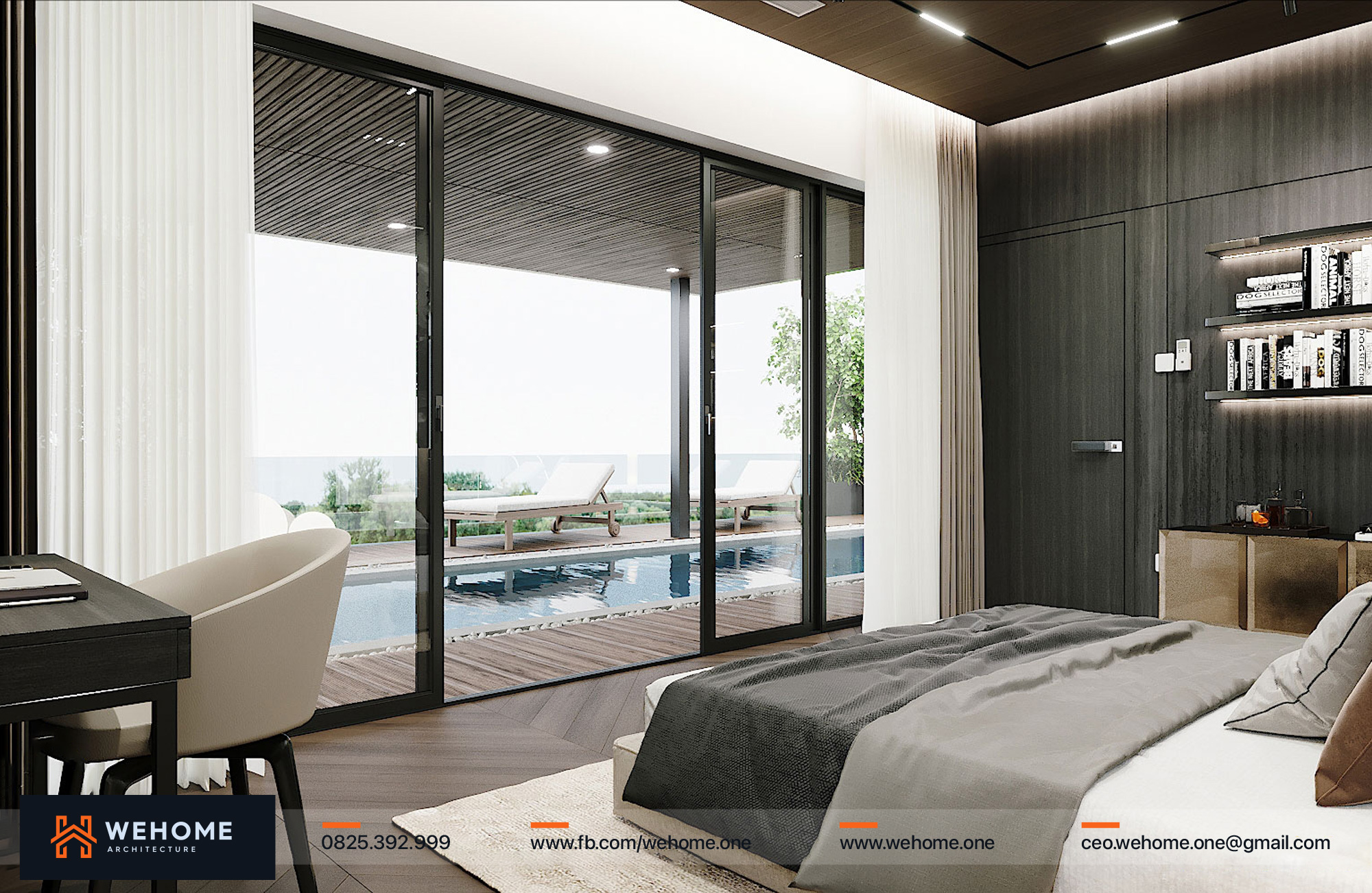 Điểm cộng lớn nhất của phòng ngủ tầng 3 chính là có view nhìn ra hồ bơi xanh mát. Tạo cảm giác cực kì thích thú và sản khoái mỗi sáng thức dậy